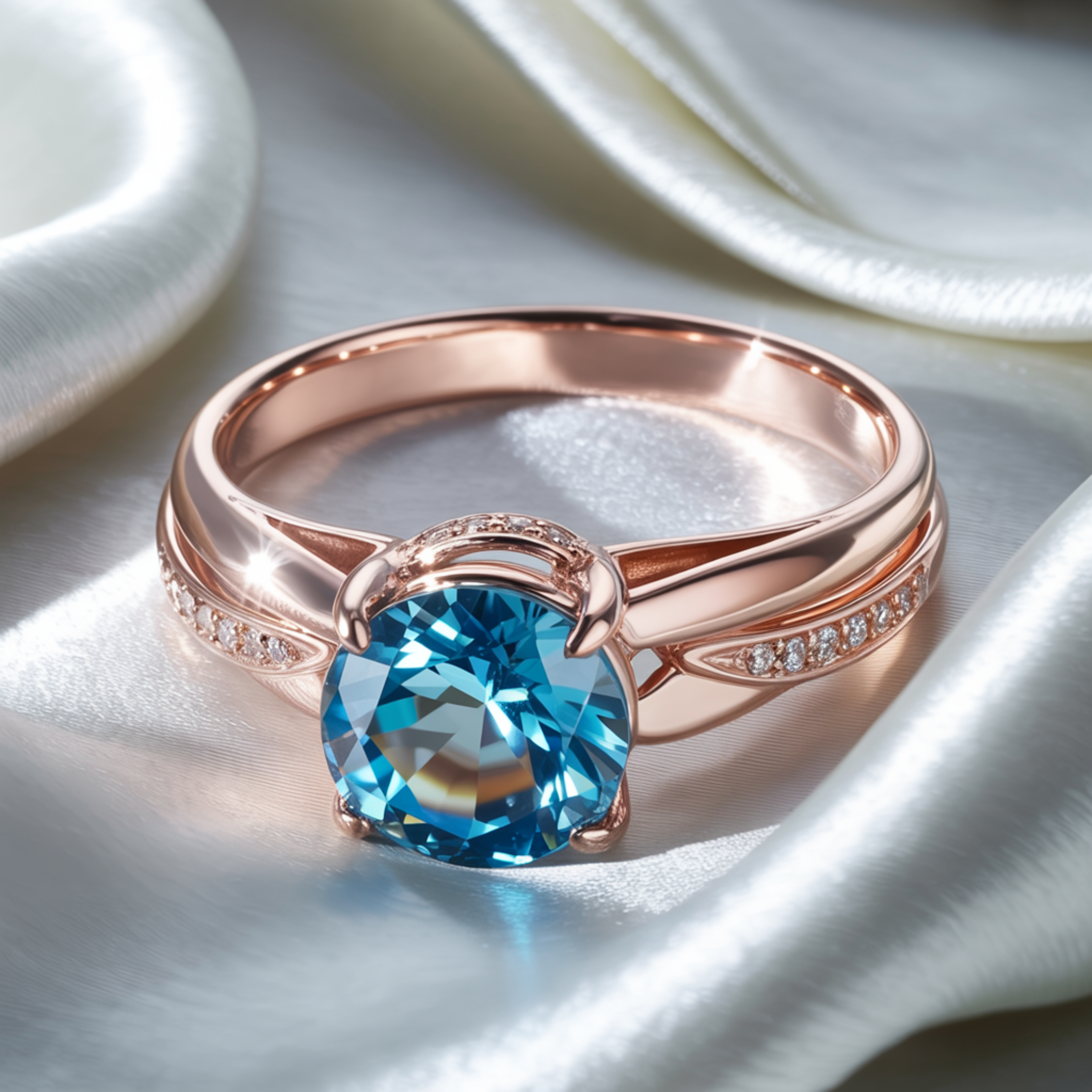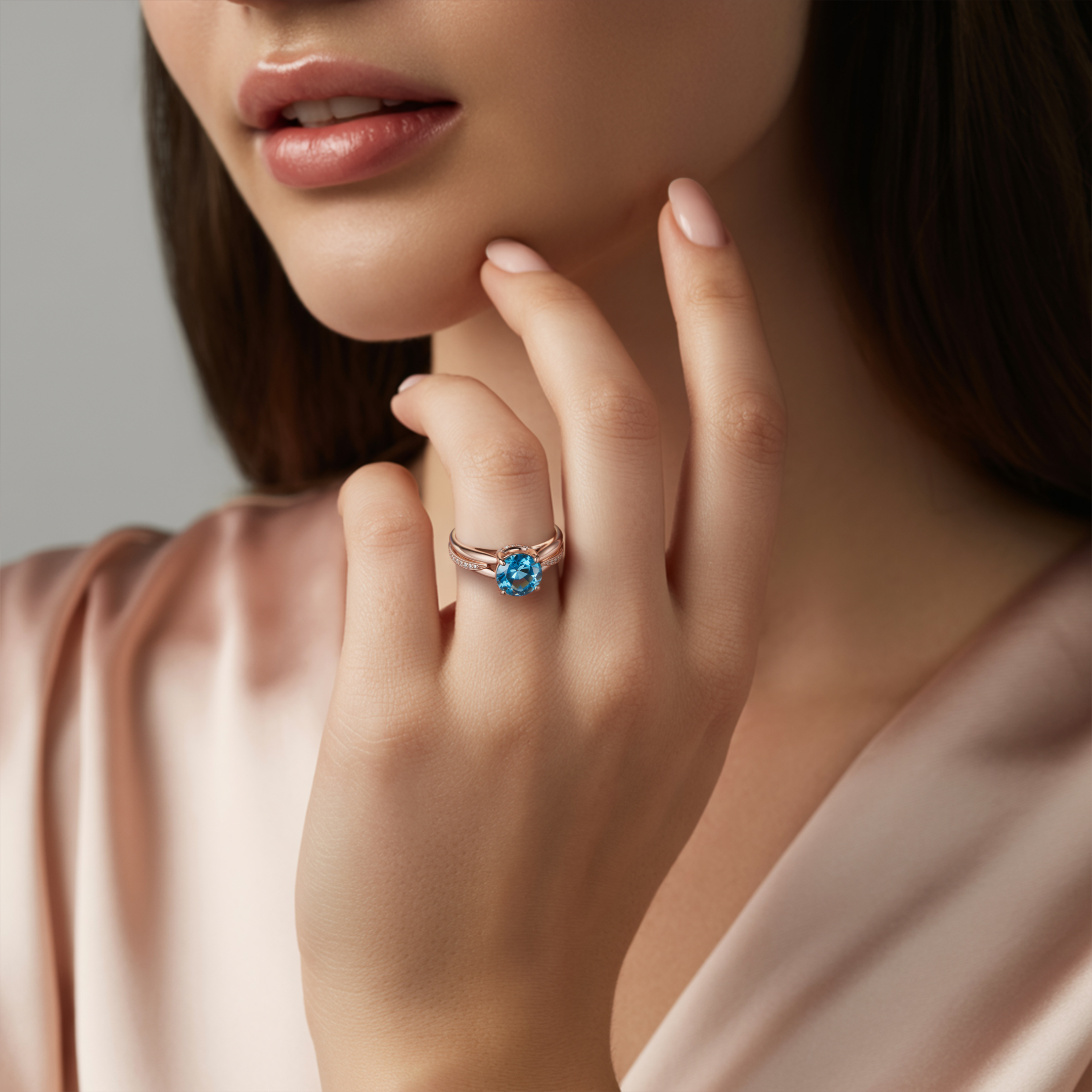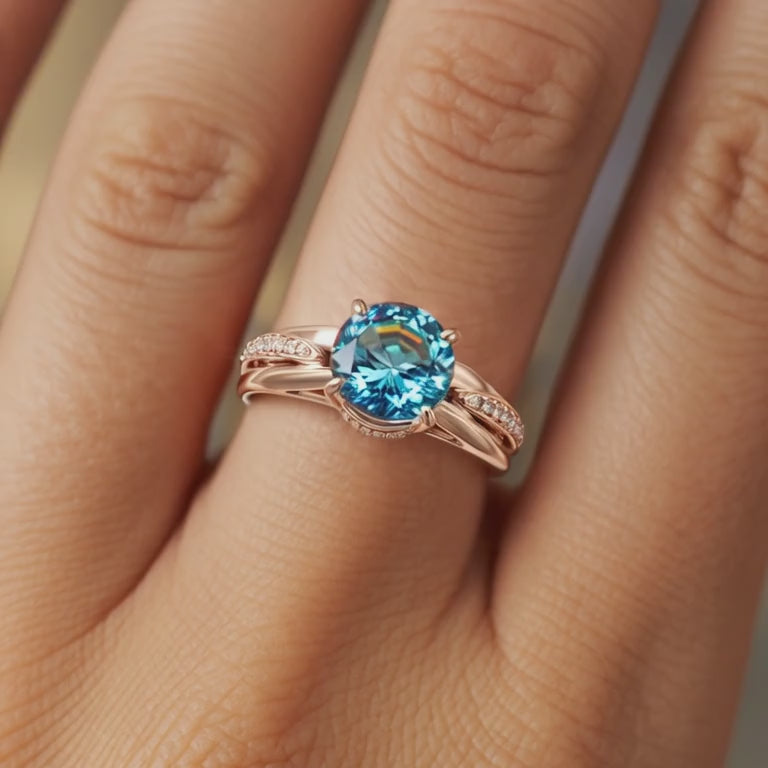 The Oceana ring presents a breathtaking union of vintage charm and sparkling elegance, featuring a brilliant blue moissanite set in warm 18K rose gold vermeil.