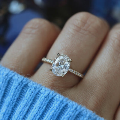 Celebrate your forever with a gold oval engagement ring designed to stun. This 2CT moissanite dazzles from every angle, cradled in a pavé-accented band with a rich 18K yellow gold finish. Sophisticated, ethical, and made to last — it’s the ultimate expression of love.