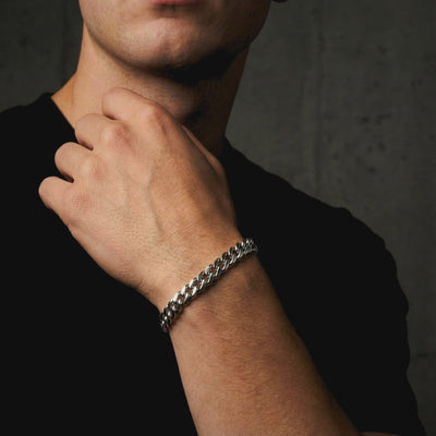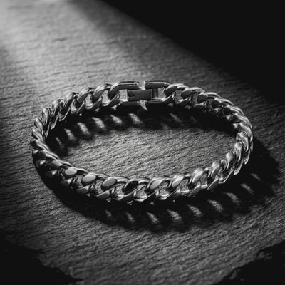 Silver 8mm stainless steel Cuban link chain laid on a dark textured slate background.
