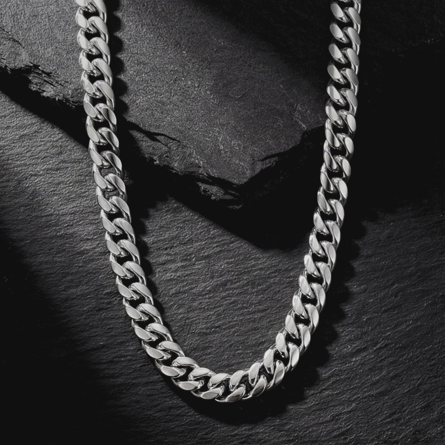 Silver 12mm stainless steel Cuban link bracelet resting on a dark textured rock surface.