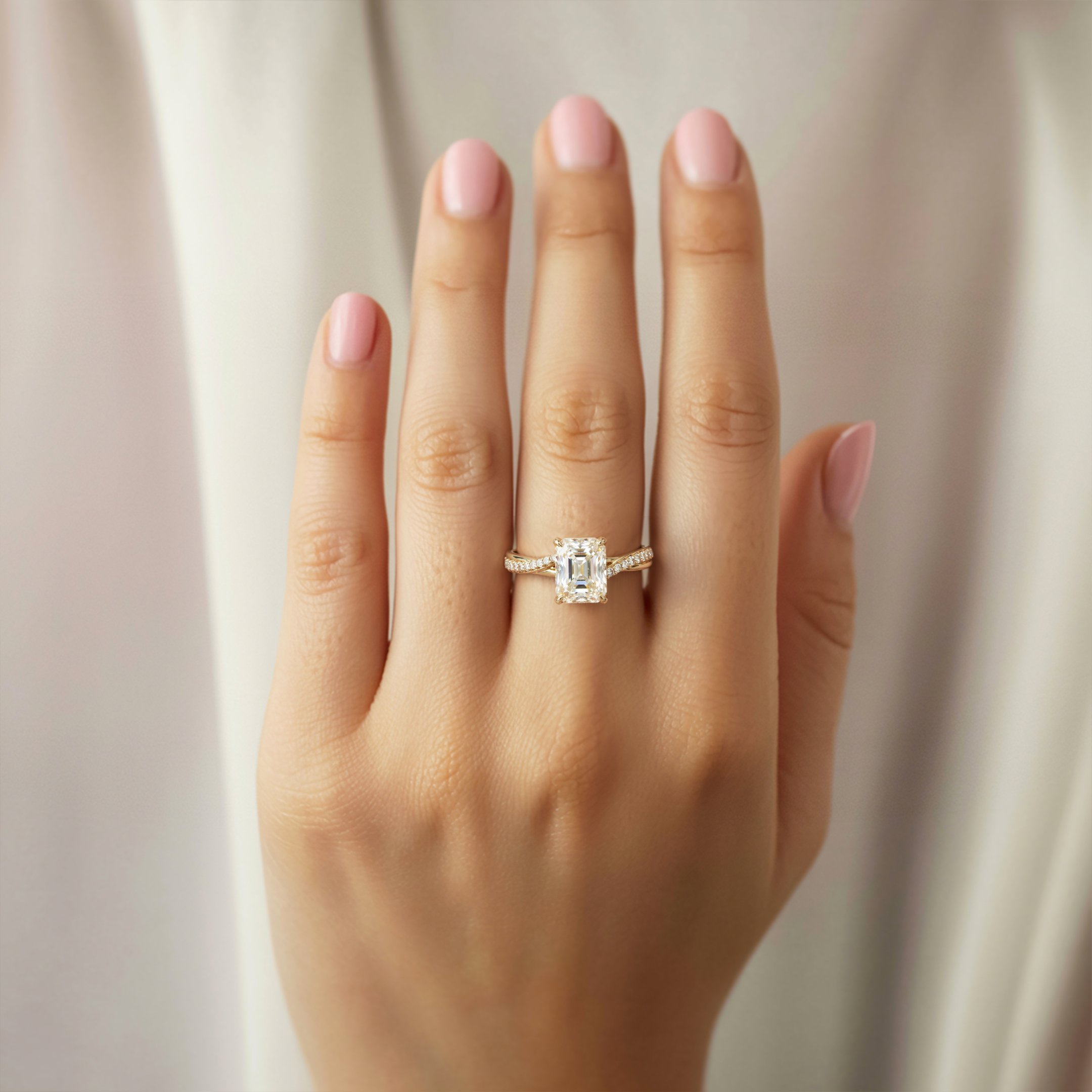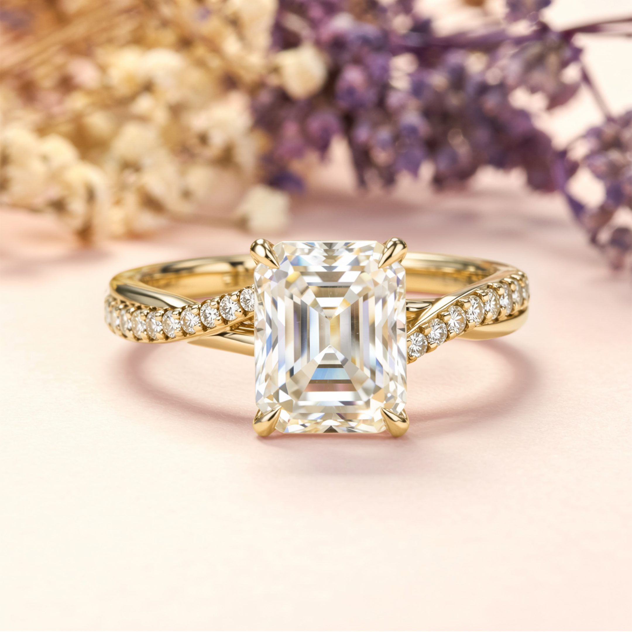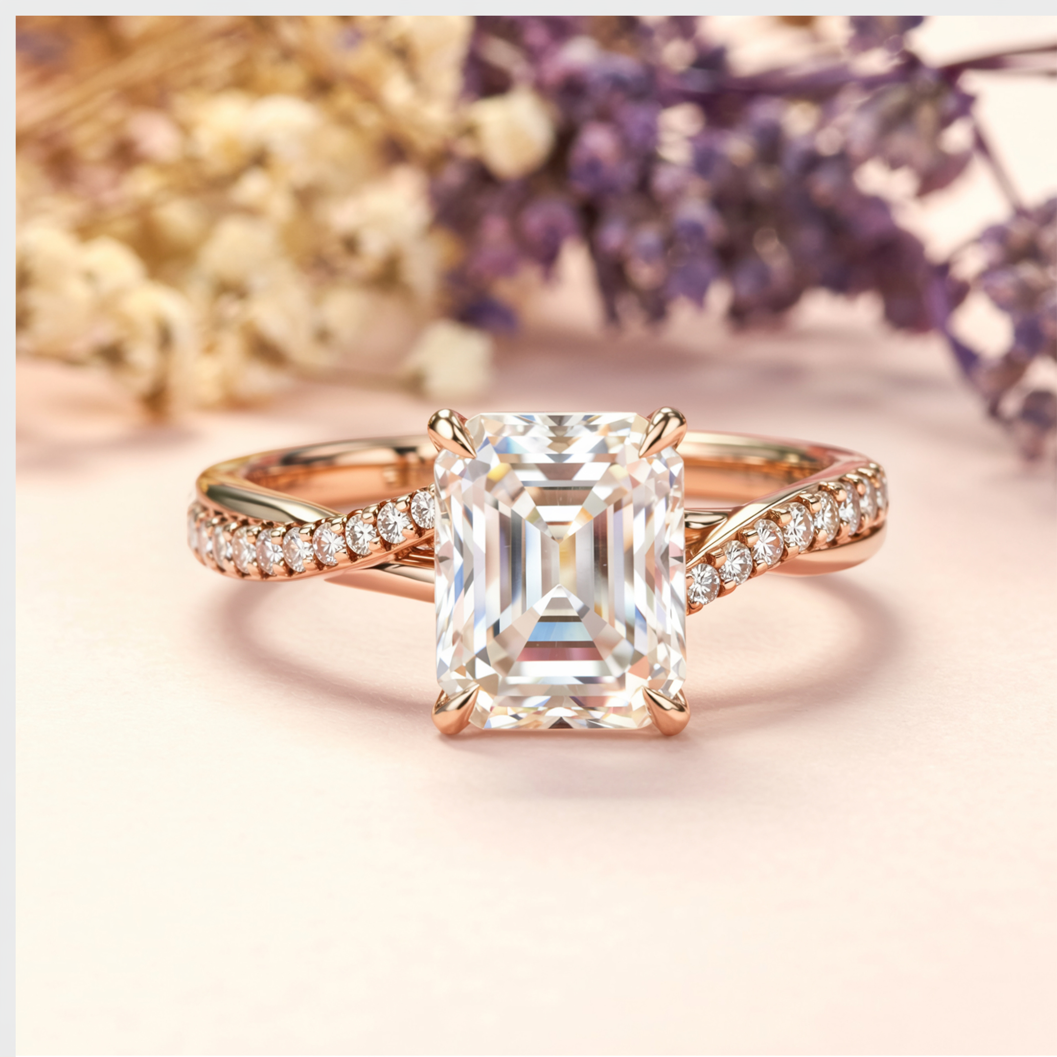 This ring intertwines sophistication with a touch of whimsy. The sparkling emerald cut center stone is perfectly complemented by the entwined band, adorned with an endless stream of smaller moissanite gems. It’s a piece designed to catch the light from every angle, creating a stunning display that’s both classic and unique.