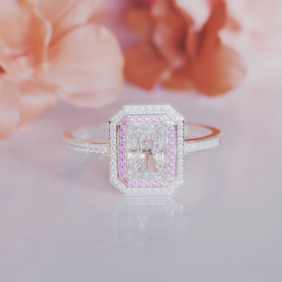 The Radiant isn't just about that showstopping center stone. It's got a whole posse of pink and white simulated diamonds forming a halo, catching light and sparkling from every angle.
