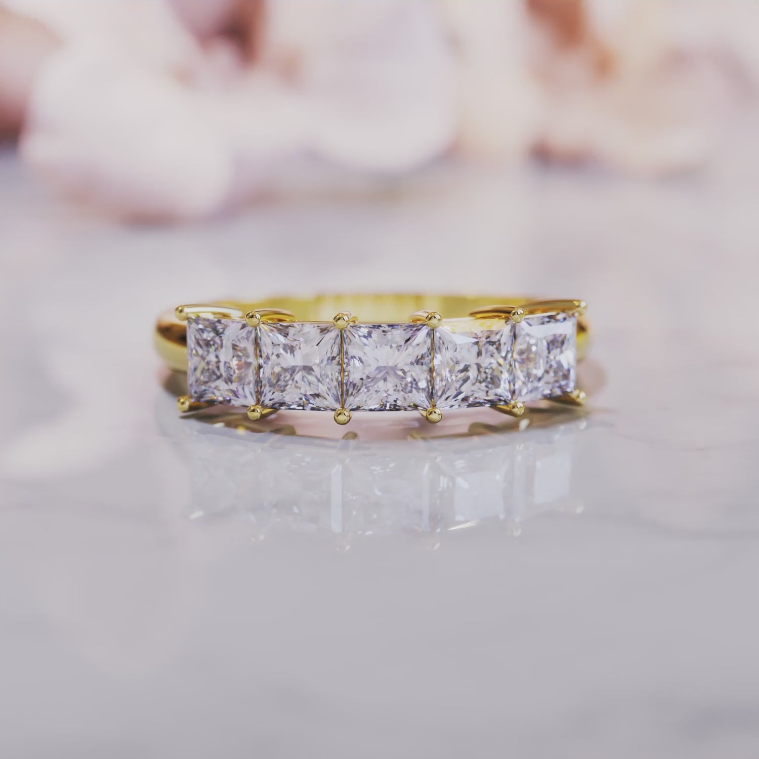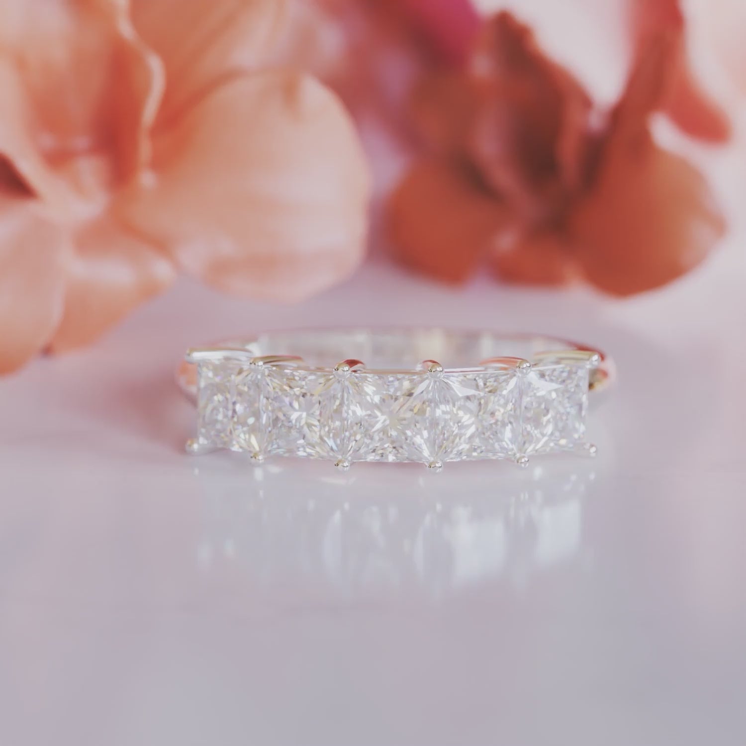 Crafted with 18K gold vermeil over 925 sterling silver, each piece in this collection is built to last. The moissanite band features a seamless row of ideal princess-cut stones in a sleek shared prong setting, maximizing sparkle.