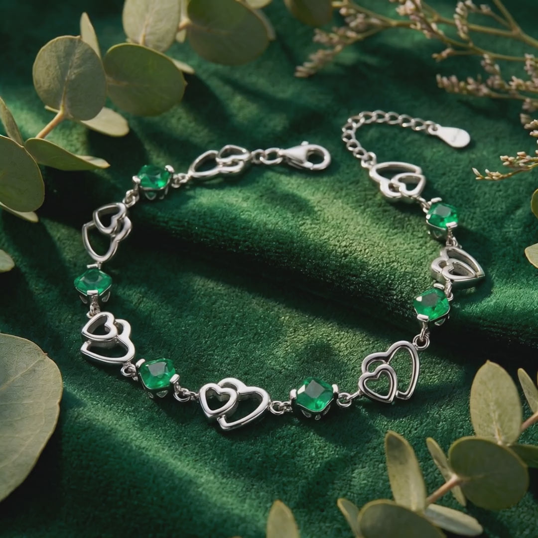 - Design: Heart-link chain with square-cut emerald-toned stones.