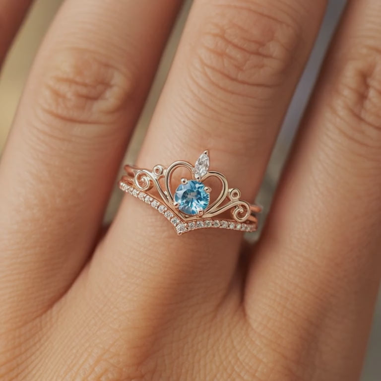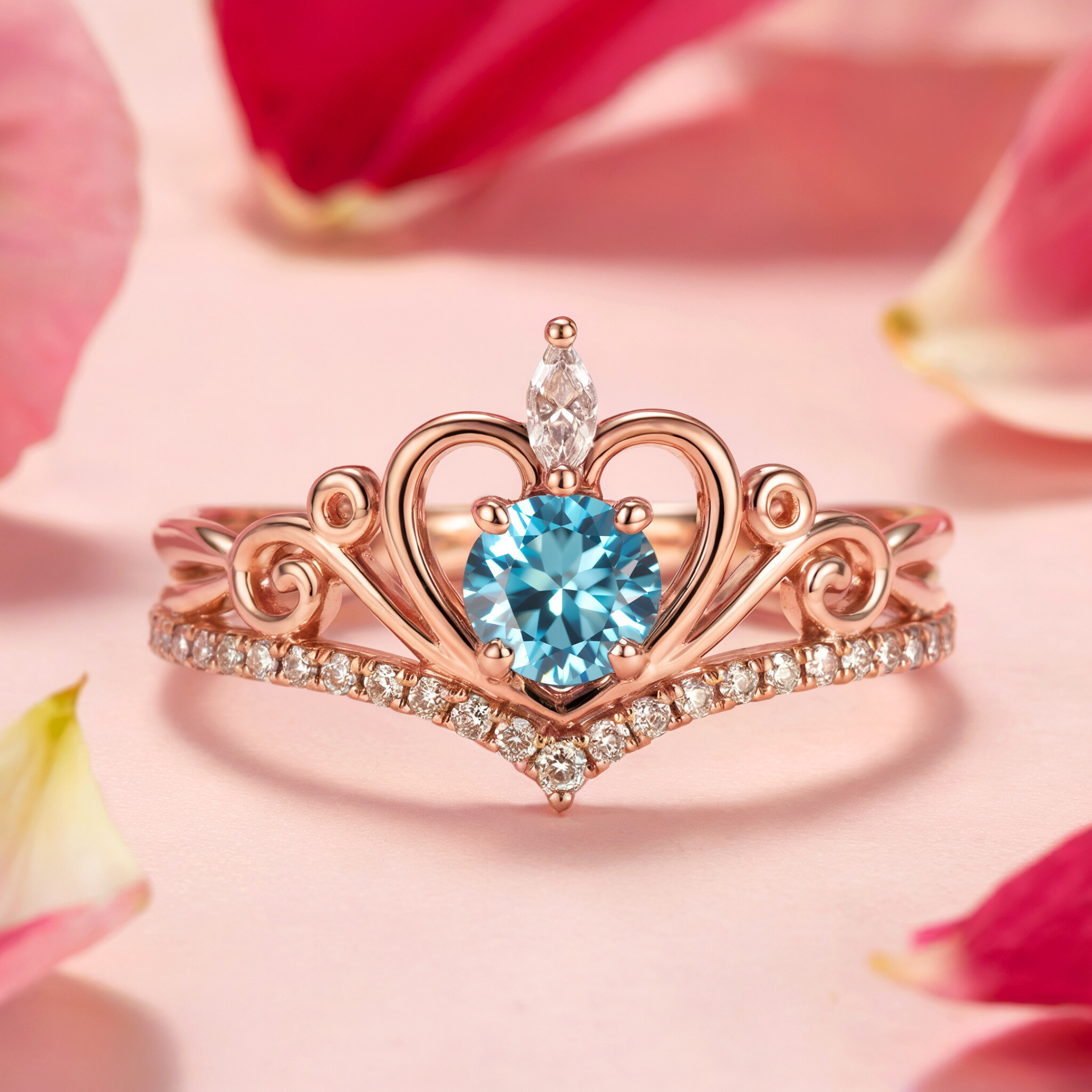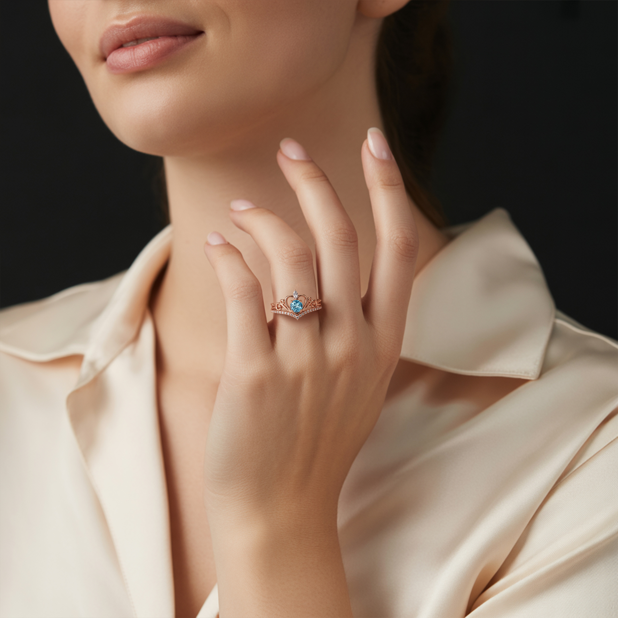 This captivating ring showcases a 1CT round-cut blue moissanite as its centerpiece, framed by a delicate tiara-like silhouette that evokes royal grandeur. The band further enhances its unique appeal with a graceful chevron pattern of eternity stones, adding exceptional sparkle and a modern twist to the classic crown motif. Crafted in stunning 18K Rose Gold Vermeil, this piece offers both luxurious aesthetics and enduring quality.