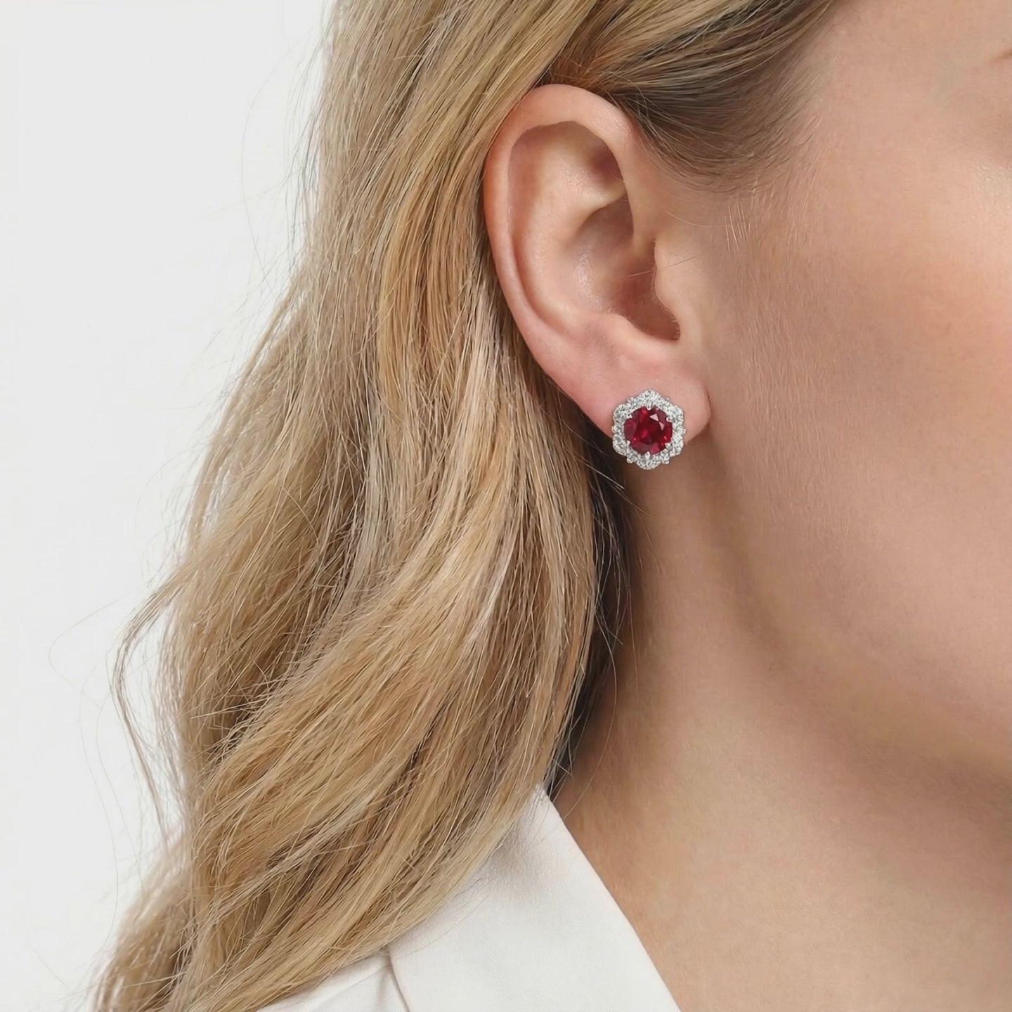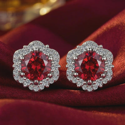 Mined rubies are often cloudy, included, or lean towards a brownish tint. We reject that inconsistency. These stud earrings feature high-performance Simulated Ruby, color-calibrated to the coveted "Pigeon Blood" red benchmark. Precision-cut for maximum light return, they deliver museum-grade saturation at a fraction of the cost.