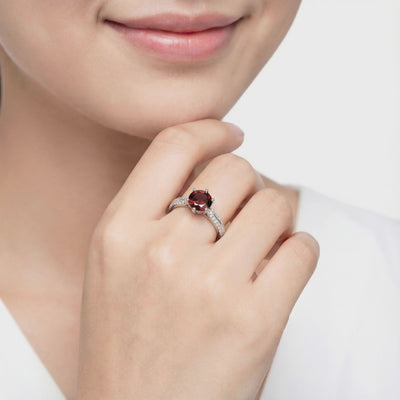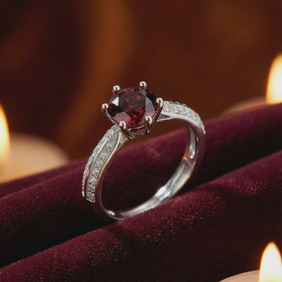 Mined garnets often suffer from inconsistent brown undertones. This January birthstone ring features a precision-cut Simulated Garnet, engineered to achieve the ideal "blood red" saturation of a museum-grade stone. Each facet is calibrated for maximum light return, ensuring this ring outperforms natural stones that cost ten times as much.