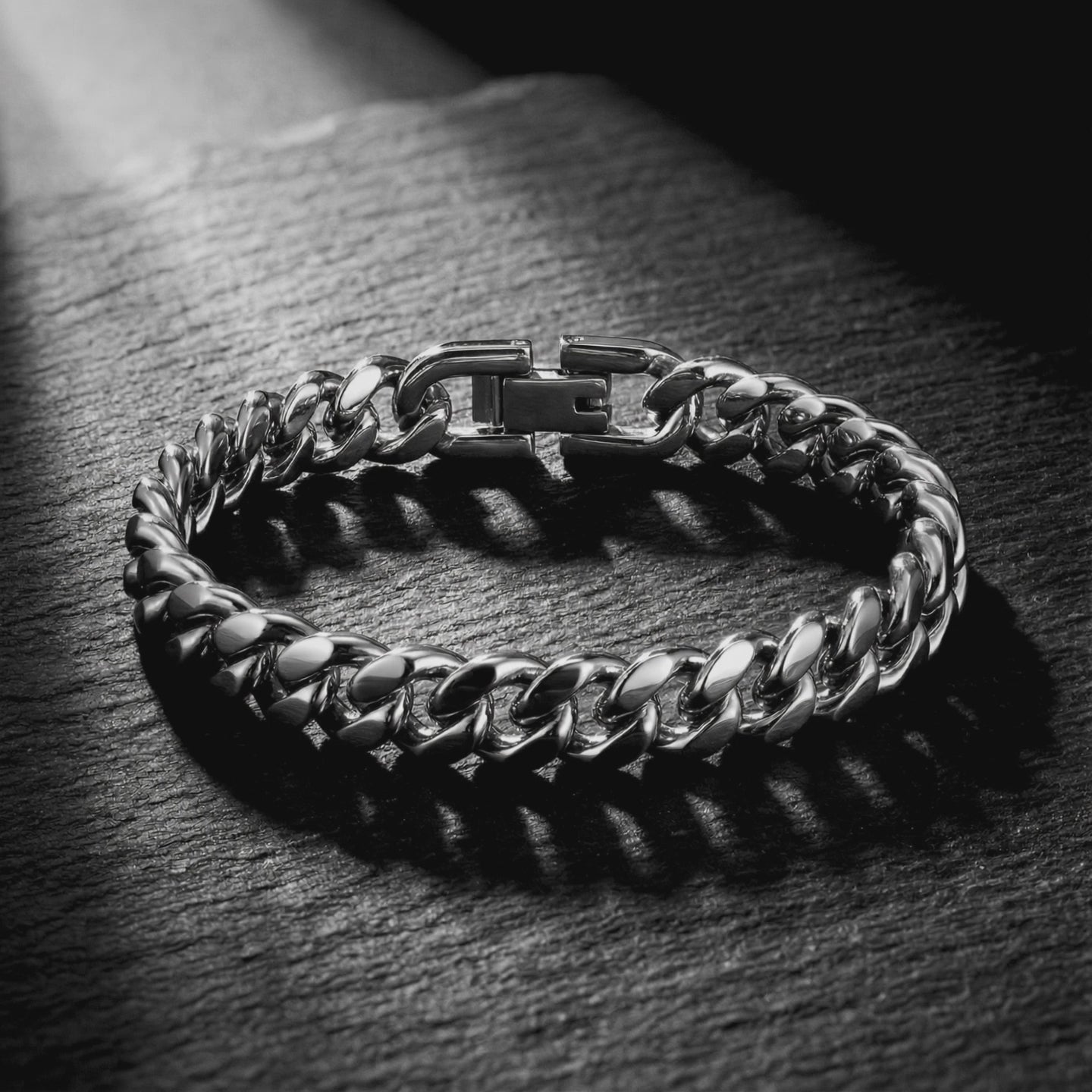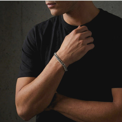 Silver 8mm stainless steel Cuban link chain laid on a dark textured slate background.