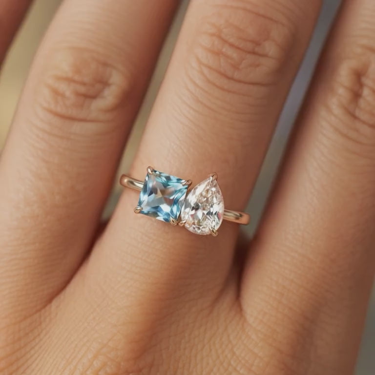 This striking ring unites a brilliant pear-cut moissanite with an elegant princess-cut moissanite, one in a deep, vibrant blue and the other in a crisp, sparkling white. Set in lustrous 18K rose gold vermeil, the toi et moi (French for 'you and me') design beautifully represents the harmony of two souls intertwined, or the elegant contrast of complementary elements coming together. It's a modern classic with a romantic heart, offering a sophisticated statement piece.