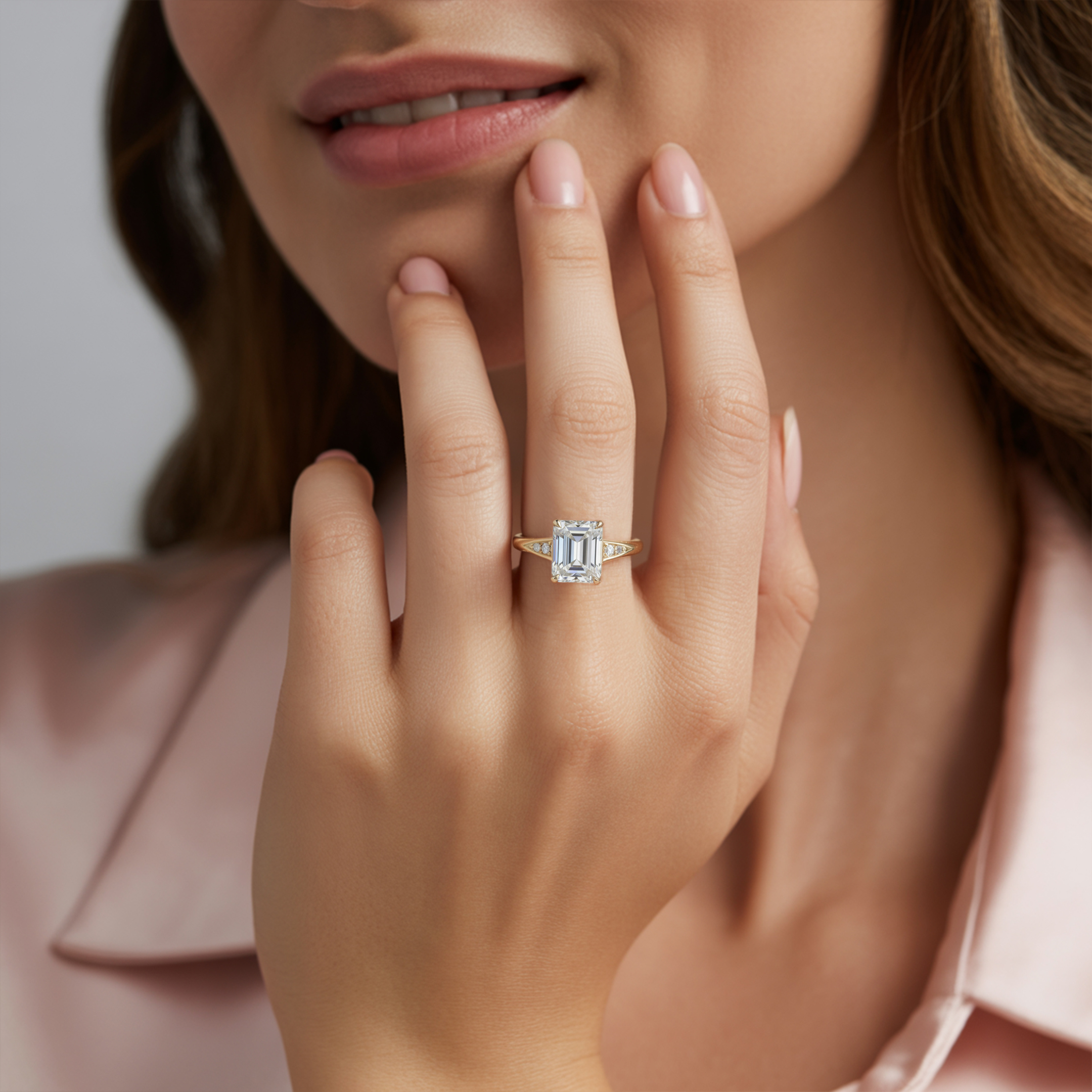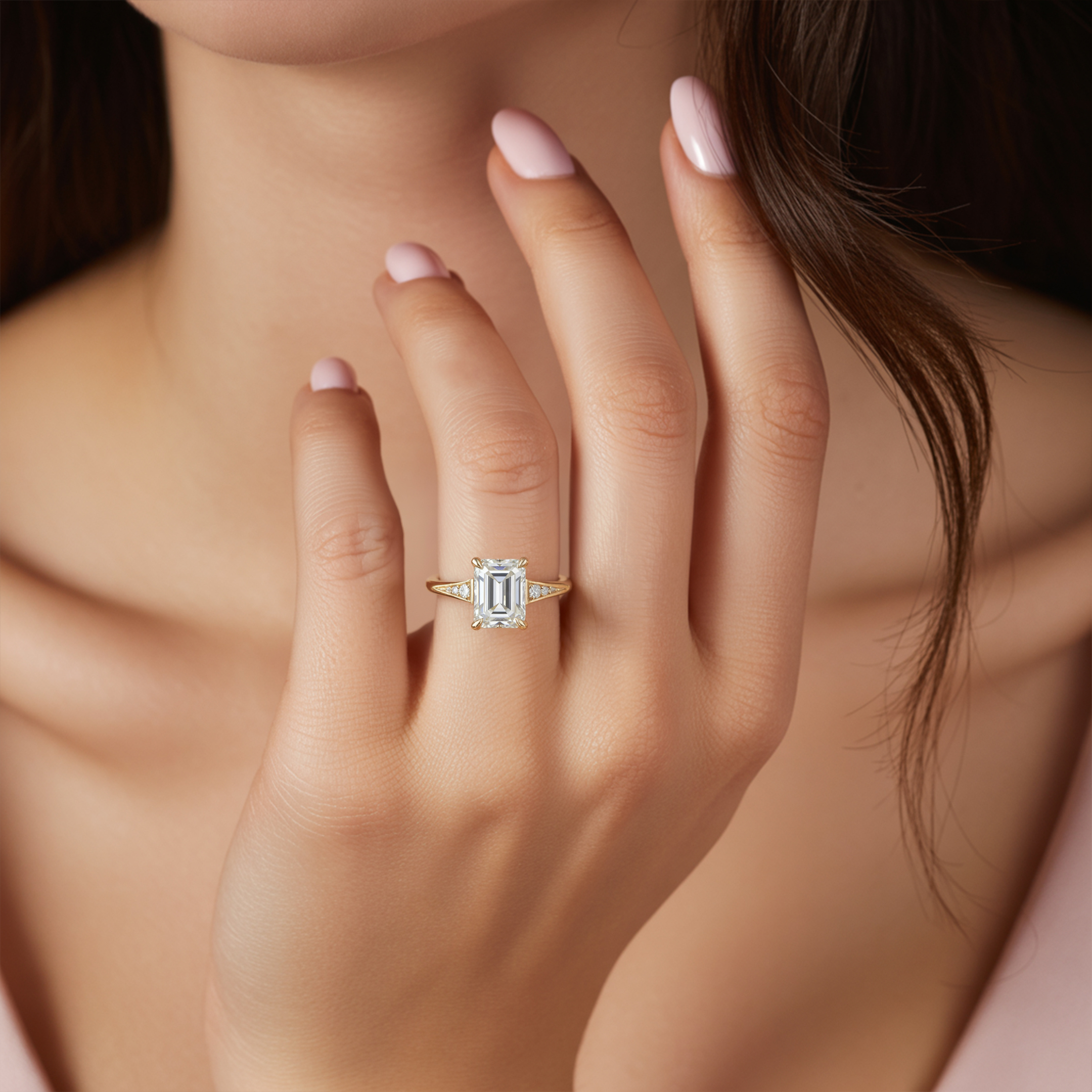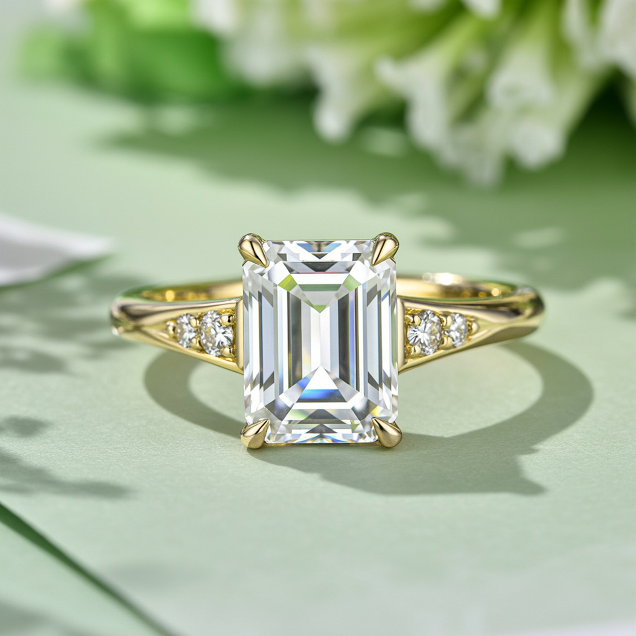 The Stellina ring showcases a breathtaking 3CT emerald cut moissanite, set to impress with its modern elegance. This design stands out, offering exceptional clarity and a distinguished silhouette.