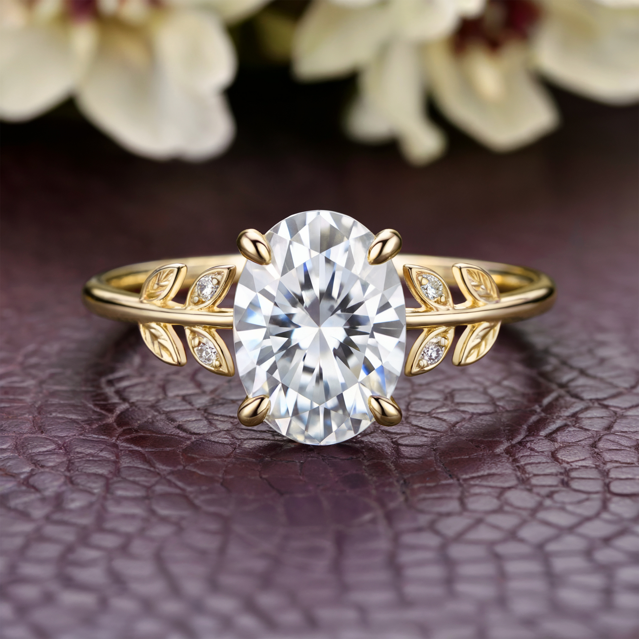 Blending botanical elegance with timeless brilliance, The Sylvara brings an ethereal, nature-inspired twist to a classic silhouette. Its luminous 2CT oval cut moissanite captures the light with diamond-like fire, while delicately sculpted leaf pavé shoulders add artisanal charm. Crafted for those who seek both visual poetry and lifelong durability.