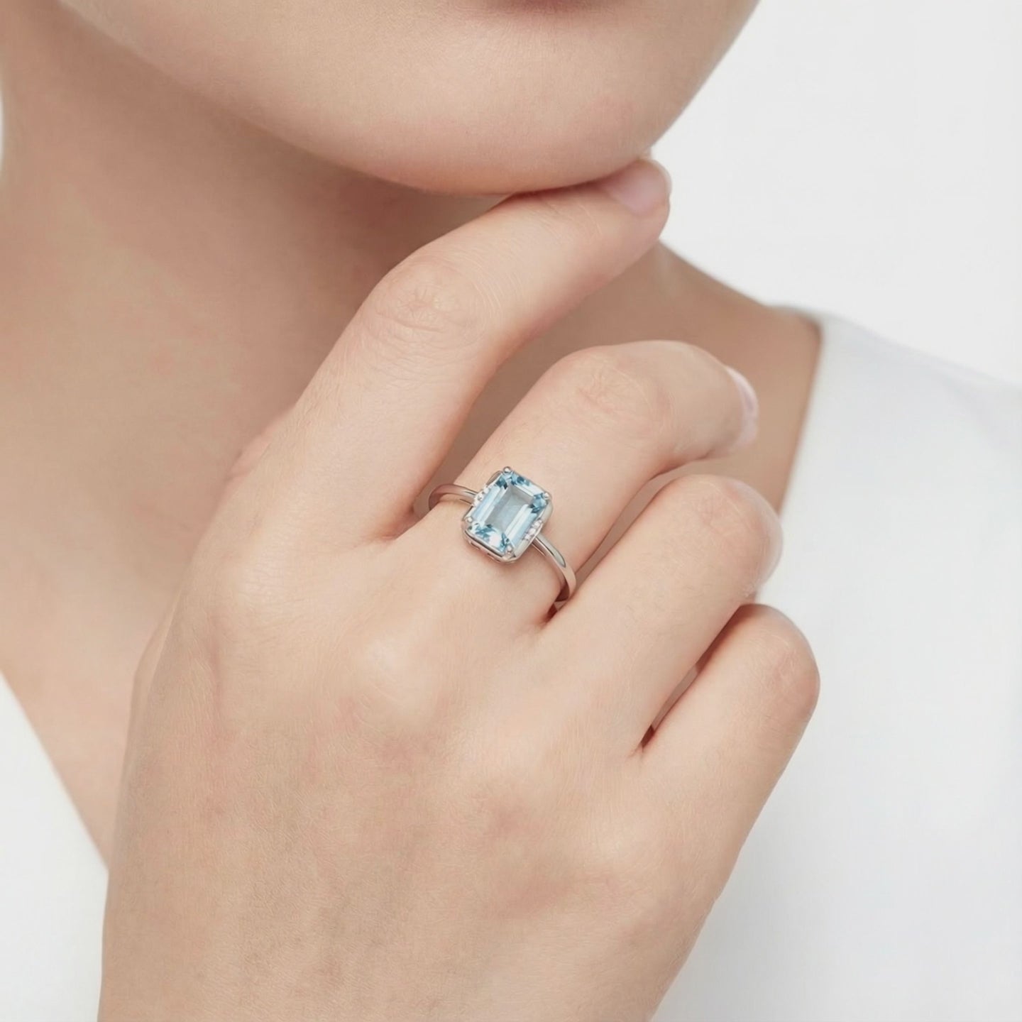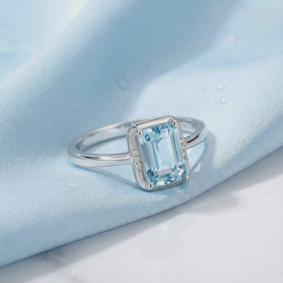 Mined aquamarines are often pale and clouded by inclusions. This is Simulated Aquamarine, engineered to match the coveted light blue saturation of the highest-grade natural stones. This emerald-cut ring is precision-cut from A5 Grade material for maximum light return and superior visual physics.