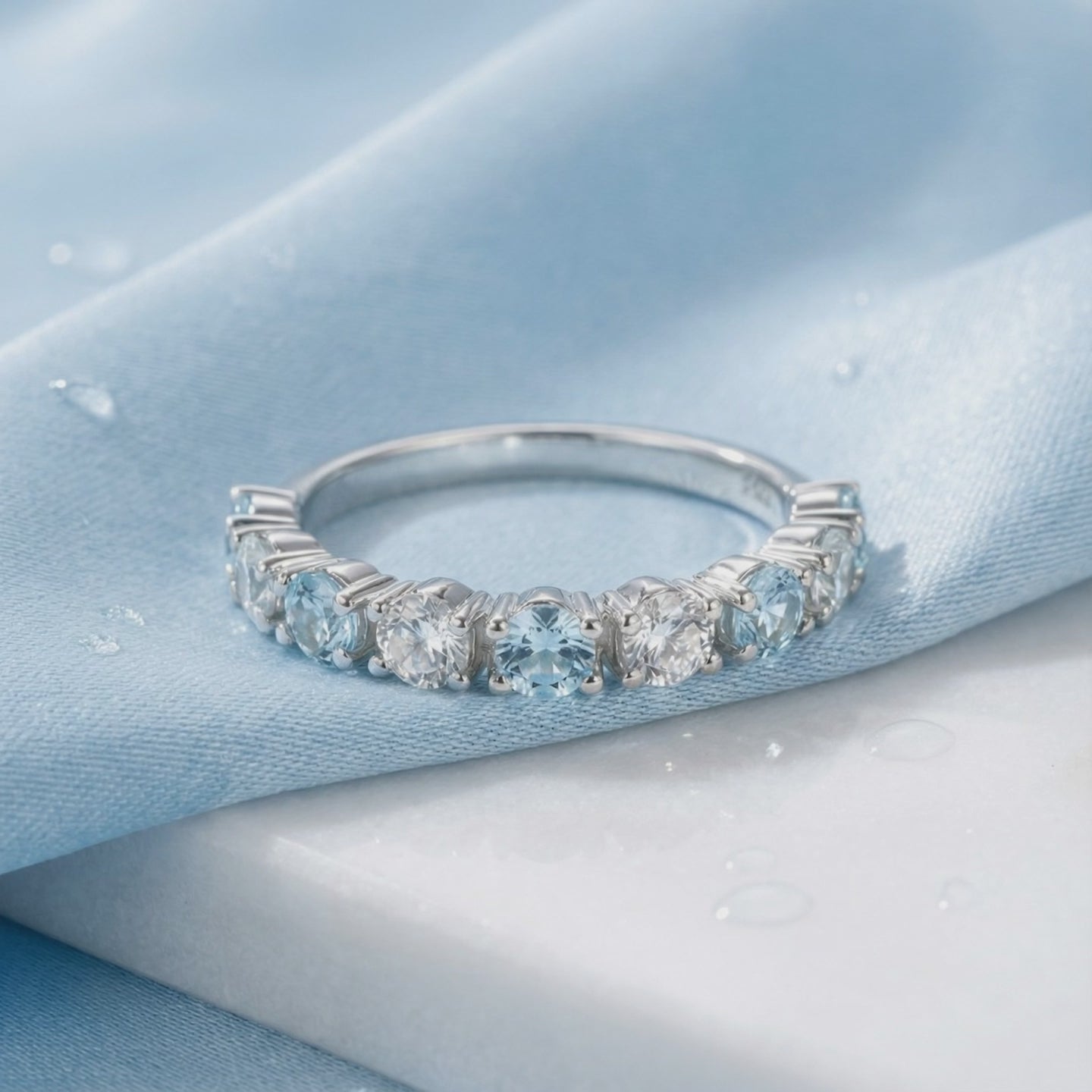 Mined aquamarines are often pale or clouded by inclusions. This ring features Simulated Aquamarine, color-calibrated to achieve the ideal light blue saturation of a museum-grade gemstone. Every stone is precision-cut to maximize light return and fire, ensuring a uniform sparkle that natural stones rarely achieve.