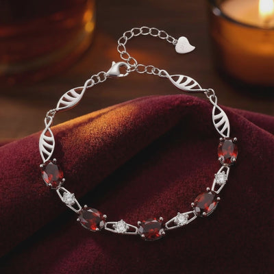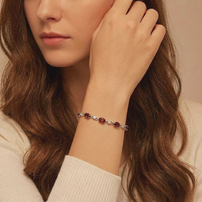 Nature rarely delivers the perfect shade of garnet. This bracelet is engineered to match the ideal "Pigeon Blood" red benchmark, featuring precision-cut Simulated Garnet stones that capture and refract light with flawless saturation. The unique DNA-inspired helix links are designed for a low profile that won't snag on your favorite sweaters or knitwear.