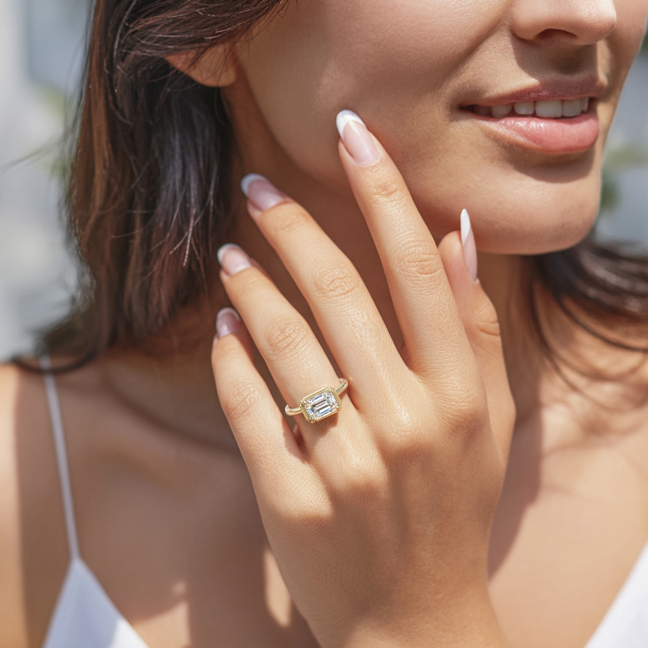 The Thalia ring takes the beloved emerald cut moissanite and nestles it securely within a sleek bezel, presented horizontally across the finger. This distinctive orientation offers a contemporary flair, combining the stone's clean lines with a confident, understated sophistication. It’s a piece designed for those who appreciate tradition but dare to wear it differently.
