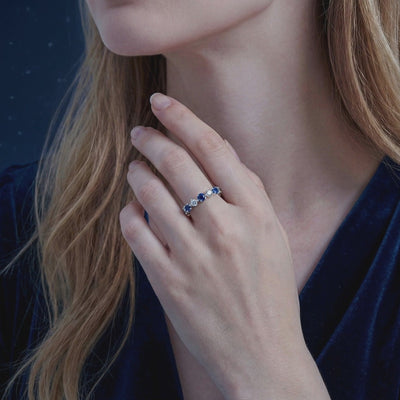 Mined sapphires are often plagued by cloudy inclusions and uneven color distribution. This ring features Simulated Sapphire, engineered to match the coveted 'Royal Blue' benchmark with velvety saturation. Each of the seven stones is precision-cut from A5 Grade material for maximum light return and optical fire, delivering a visual profile that nature rarely achieves consistently.
