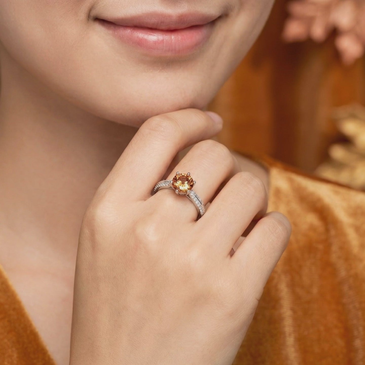 Mined topaz often carries uneven color zones or visible inclusions. This engineered ring features a Simulated Topaz, color-calibrated to the ideal honeyed warmth and golden-orange saturation that defines the finest November birthstone specimens. Each stone is precision-cut from A5 Grade material to ensure maximum light return and brilliance.