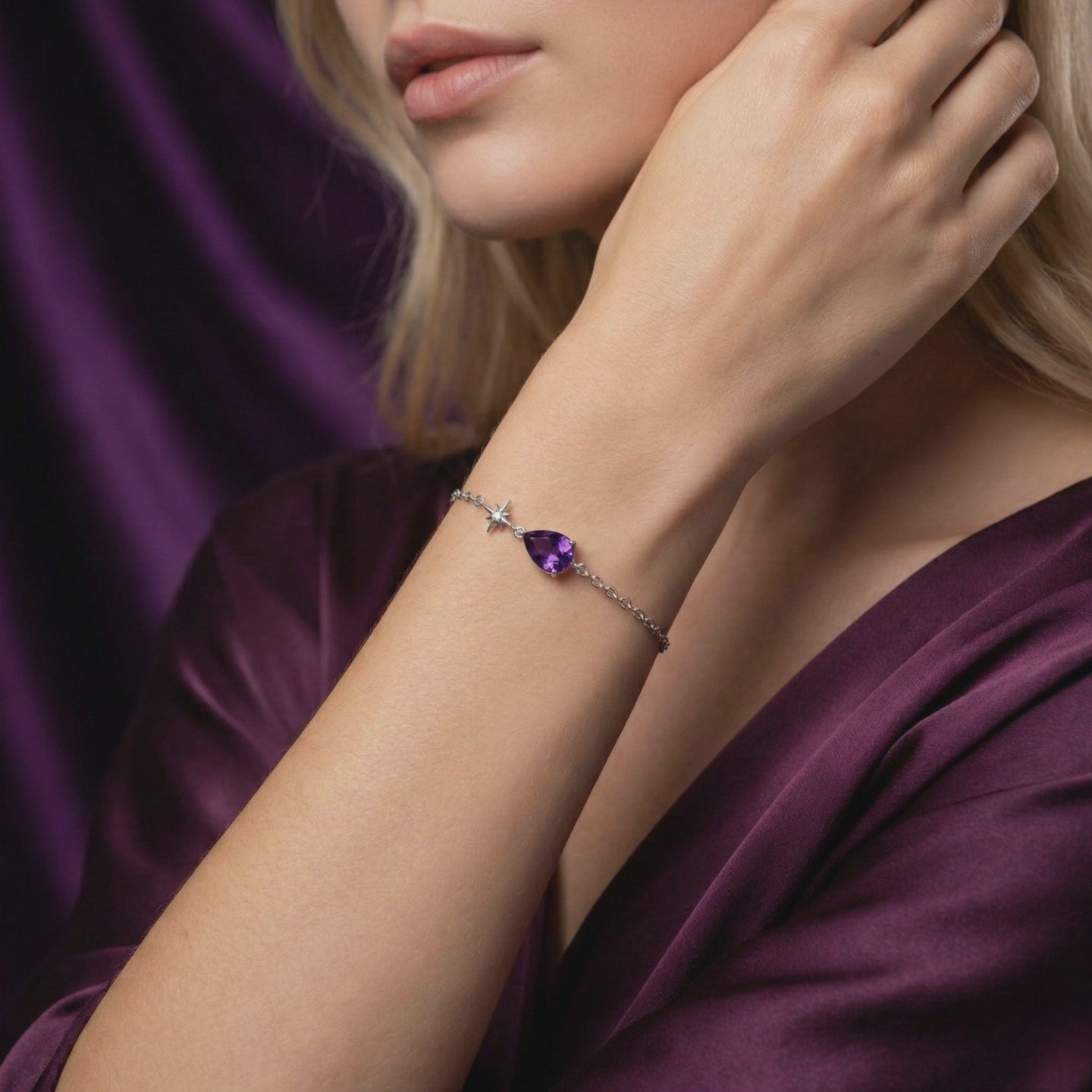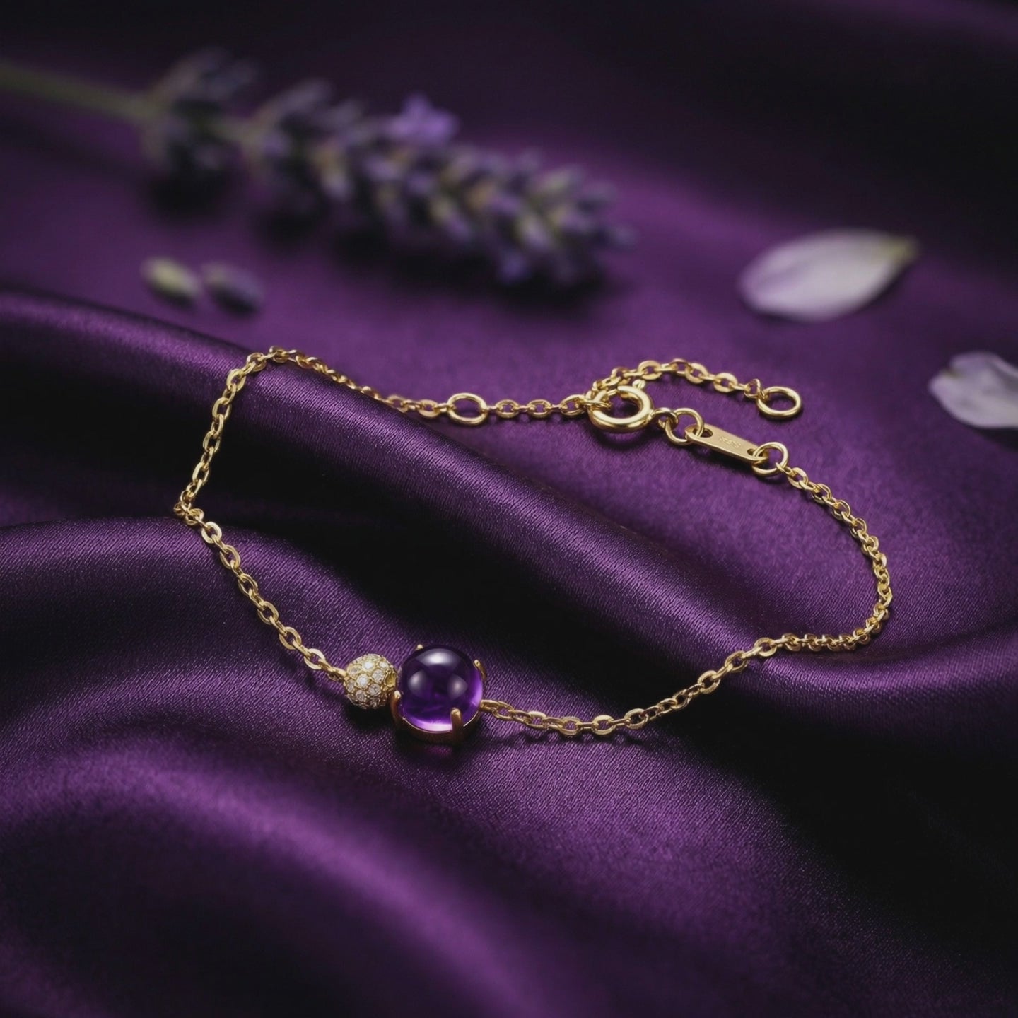 Radiate the regal elegance of the ages with The Veraline Bracelet. This breathtaking piece features a 100% Natural Amethyst, boasting a deep, saturated violet hue that commands attention. Precision-faceted in a classic Round Cut (6mm), the stone captures and refracts light with mesmerizing brilliance, creating a window into geological wonder.