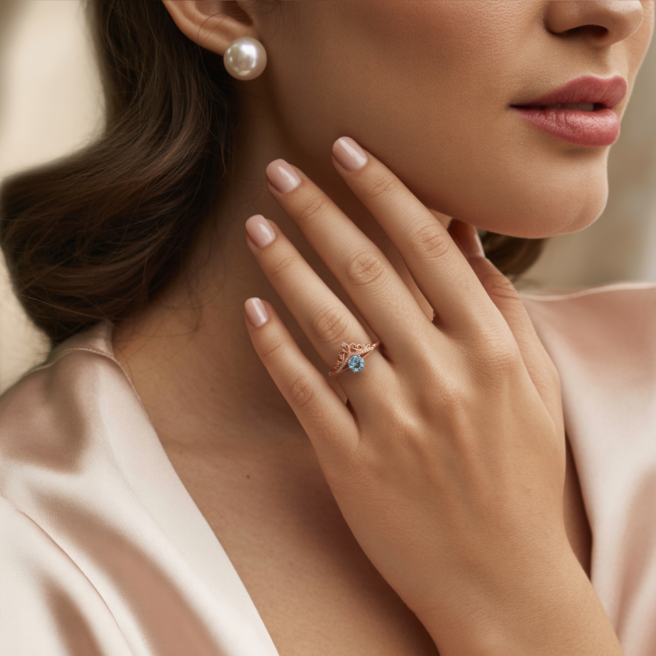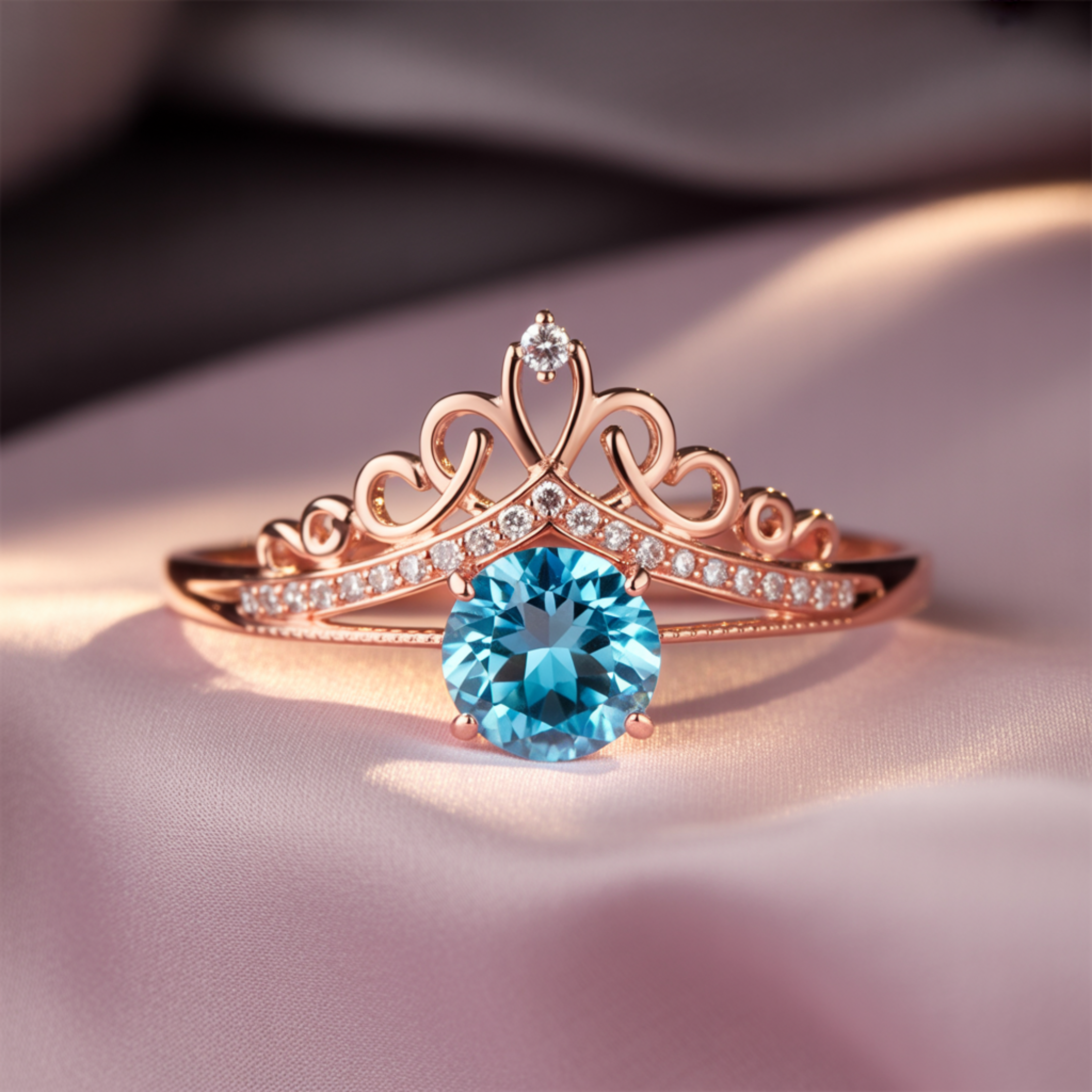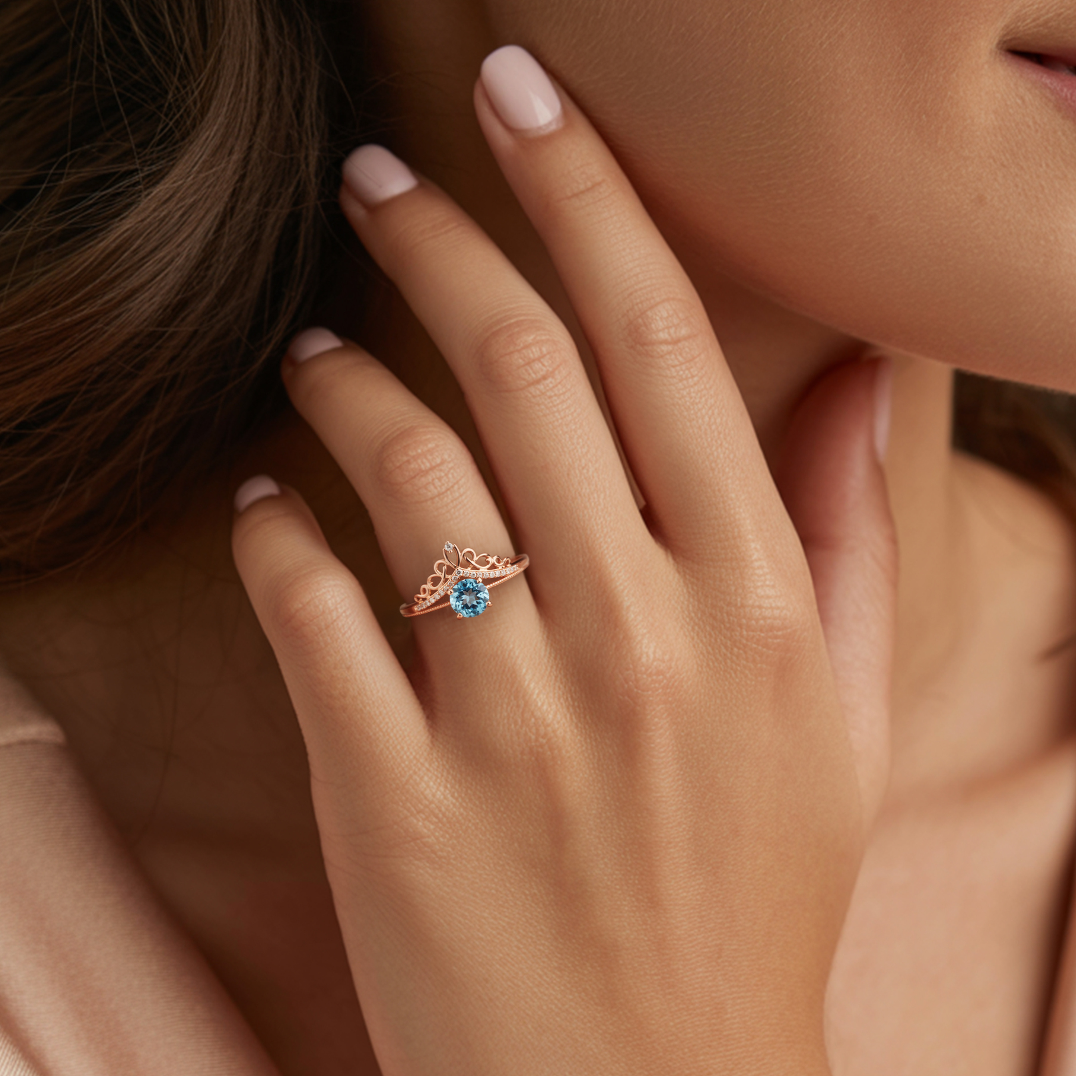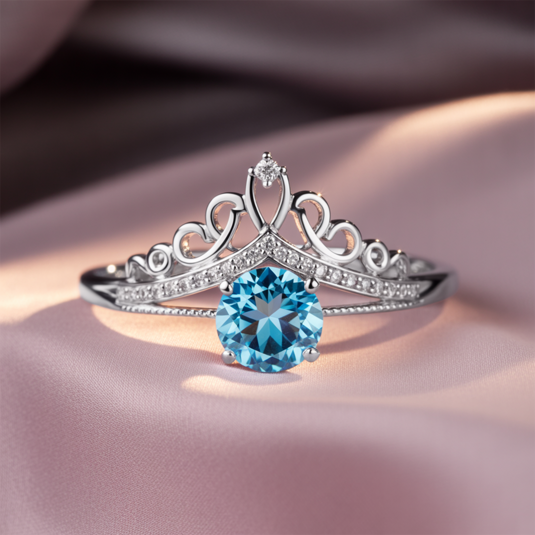 Discover The Vespera, a truly exceptional moissanite ring designed to make you feel like royalty. Its distinctive tiara-inspired silhouette and radiant blue center stone offer a blend of regal elegance and captivating charm.