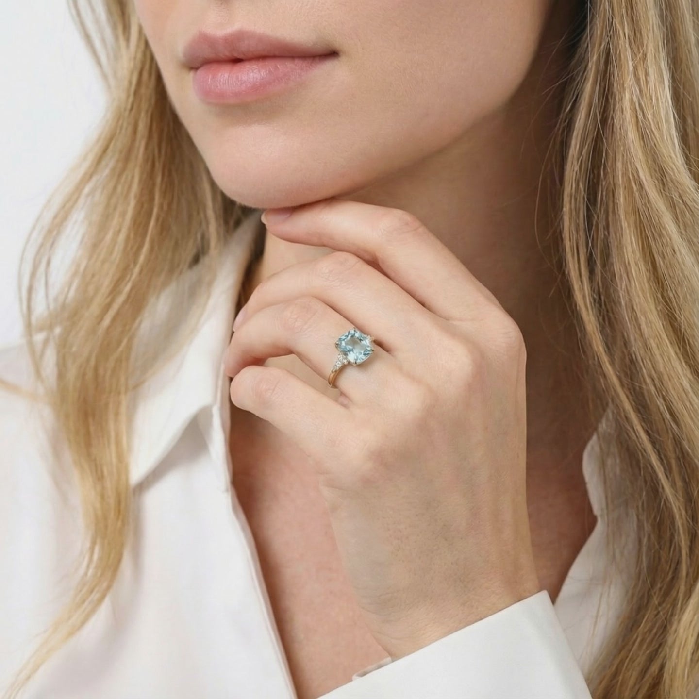 Nature rarely delivers the perfect shade of light blue, but engineering does. This cushion-cut ring features Simulated Aquamarine, color-calibrated to match the ideal, deep saturation of a museum-grade heirloom. Precision-faceted for maximum light return, it offers more visual impact than mined stones at a fraction of the cost.