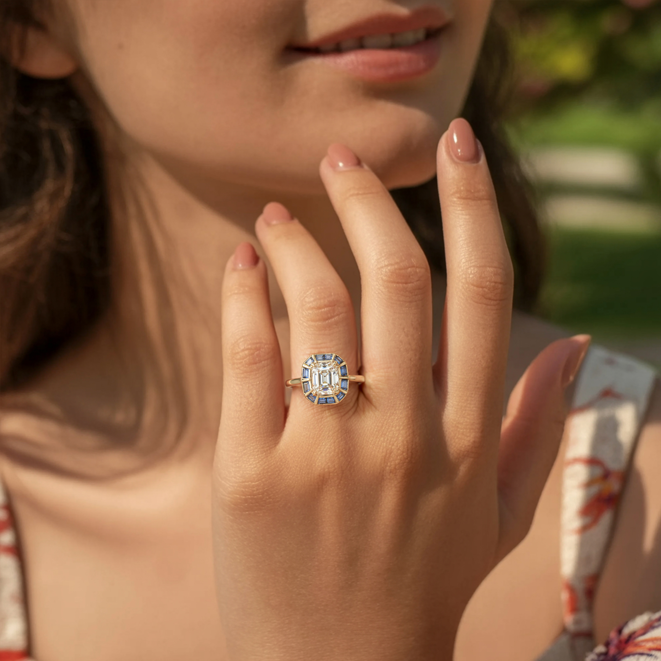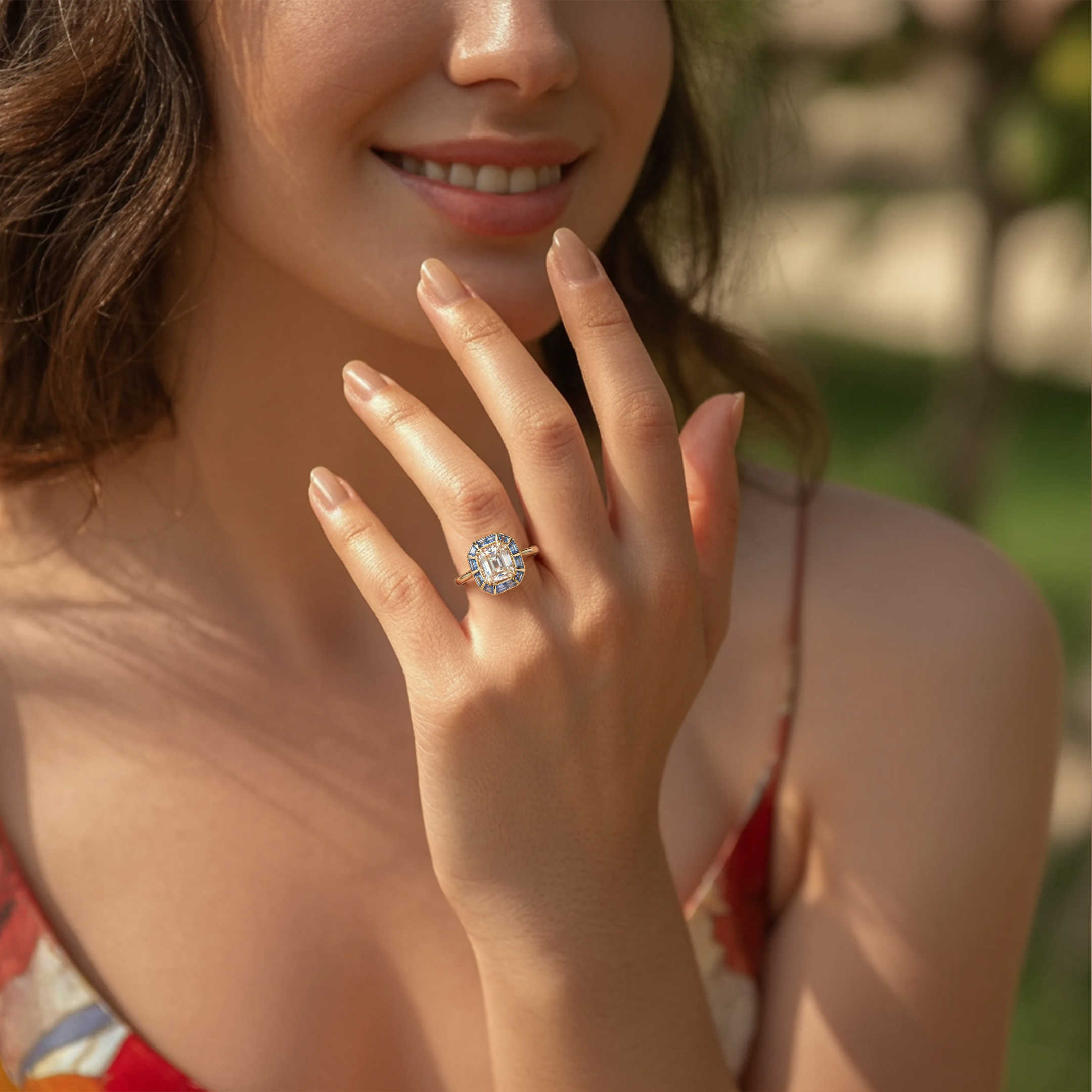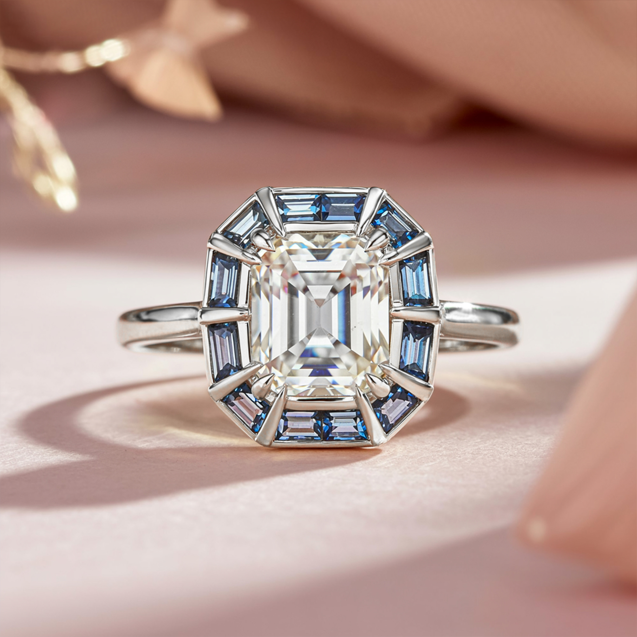 This ring showcases a brilliant 3CT emerald cut white moissanite, beautifully framed by a halo of bezel-set blue moissanite stones. The precise bezel setting not only enhances the vibrant blue accents but also ensures a sleek profile and exceptional stone security, making it a sophisticated choice for any occasion.