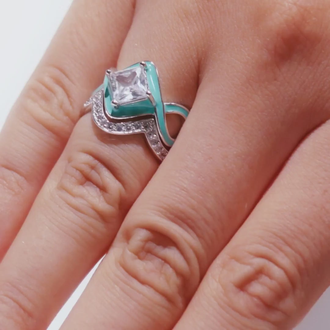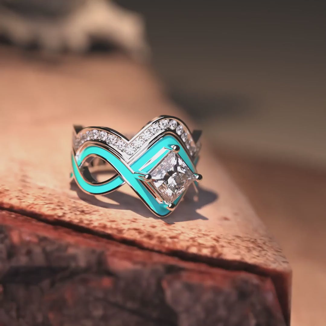 This stunning two-piece stackable set features a dazzling 1.5CT princess-cut lab diamond that radiates brilliance. The main band is framed with intricate turquoise enamel detailing, while the accompanying chevron band is adorned with sparkling accents, creating a bold yet elegant design.