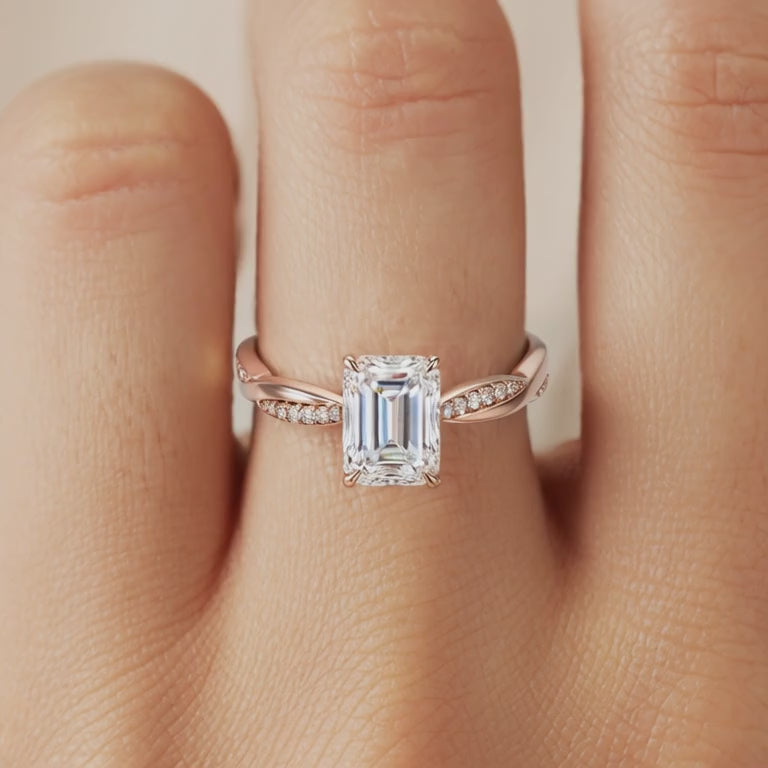 Forget everything you thought you knew about classic rings. Our twisted band design takes the sophisticated 1CT emerald cut moissanite and gives it a modern, confident edge. It’s not just a ring; it's a statement that says you appreciate unique style and dazzling brilliance.