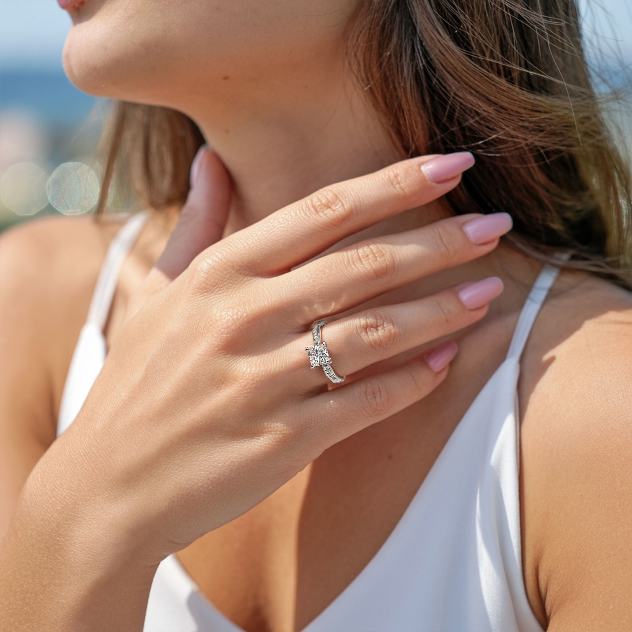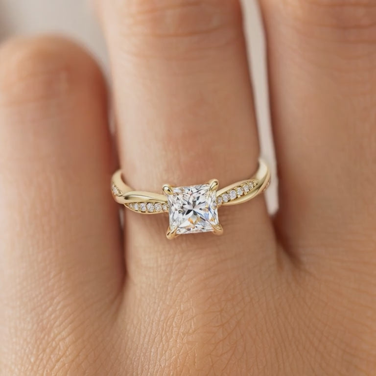 This isn't just any ring. We've taken the striking 1CT Princess cut moissanite – known for its sharp, clean lines and brilliant sparkle – and set it in our unique twisted band. The D-color, VVS clarity center stone isn't just beautiful; it gives off more fire and brilliance than even a diamond, catching light from every single angle when you move your hand. The modern twisted band isn't just a pretty detail either; it's also set with tiny accent stones that double the sparkle, making your hand truly pop.