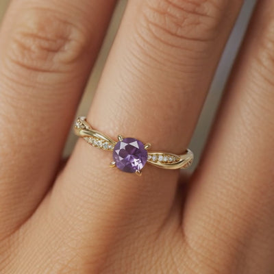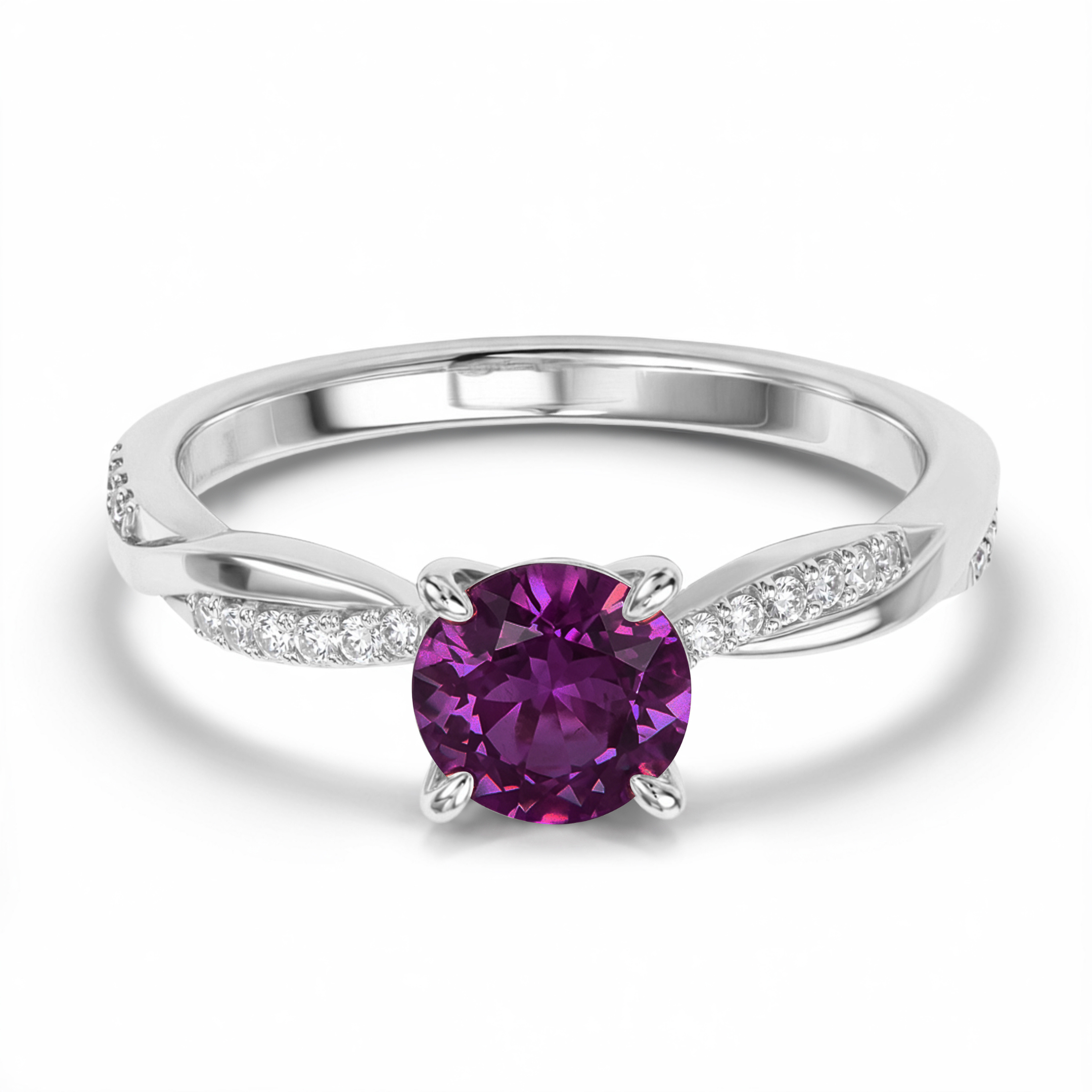 This isn't your typical solitaire. Our twisted band design takes the classic 1CT round moissanite and gives it an edge—literally. The result? A ring that catches light from every angle. Royal elegance. The rich purple tone exudes luxury and individuality.