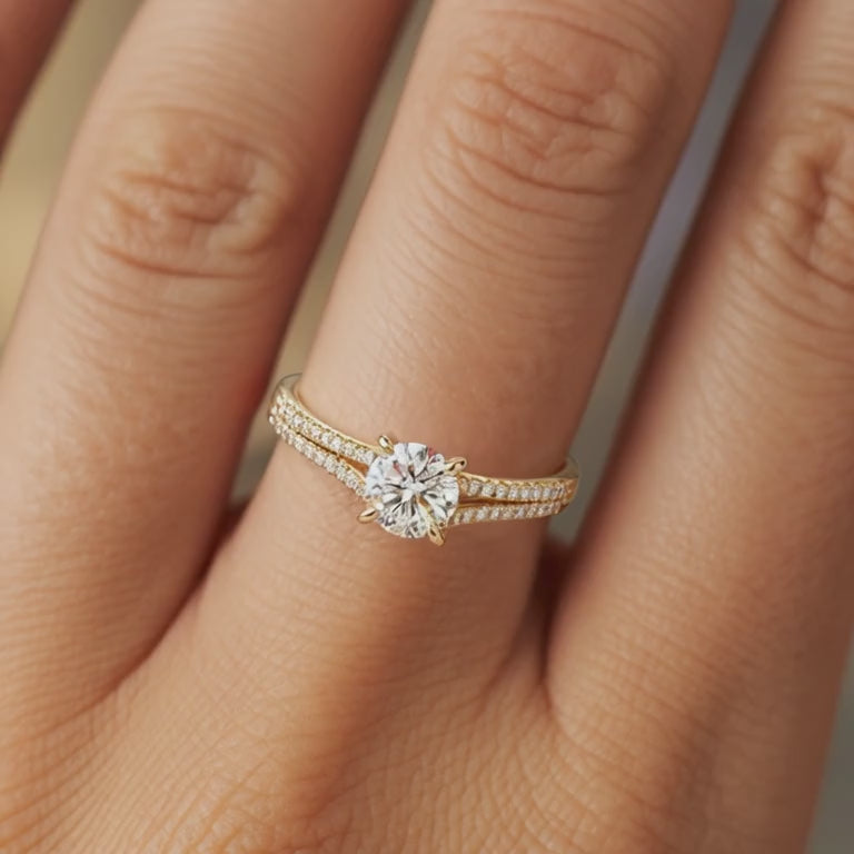 This isn't your typical solitaire. Our split shank band design takes the classic 1CT round moissanite and presents it with an elegant embrace. The result? A ring that catches light from every angle while the D-color, VVS clarity center stone delivers more fire than any diamond.