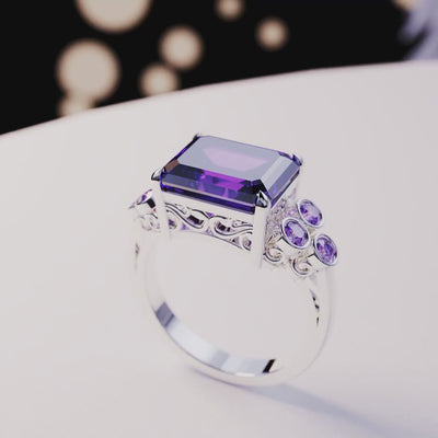A bold and beautiful simulated amethyst sits like a crown in the center of a gemstone halo. The sides covered with beautiful simulated diamonds and purple enamel. Underneath you have premium quality silver with 4 layers of platinum for lasting durability and shine.